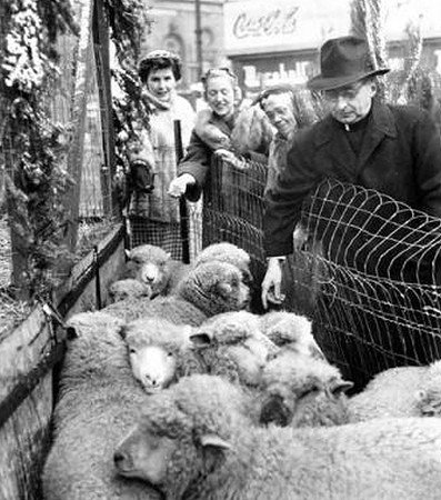 This year also saw the customary War against Christmas Denial in full swing. But fortuitously The Scene, Cleveland’s alternative weekly, published photos making it harder to maintain such denials: black and white pictures from Cleveland Christmases past—including pictures of angels used as decorations in 1973 in Higbee’s downtown department store (where A Christmas Story was filmed); pictures of live sheep as part of a Christmas display on downtown’s Public Square in 1954; pictures of a Nativity scene in Public Square in 1963; and, most amazingly, pictures of the Terminal Tower (Cleveland’s tallest building at the time, and the tallest building in America outside of Manhattan until 1964) lighted up in the shape of a cross in 1938, 1957, and 1963. [22 Nostalgic Photos of Downtown Cleveland at Christmastime, December 4, 2014] Needless to say, these days Nativity scenes are rare in public spaces (though one—recently editorially disparaged by The Plain Dealer as “cheesy”—somehow survives on Public Square), angels don’t appear in many department store decorations, sheep aren’t used in many “holiday” displays, and skyscrapers aren’t lighted up as crosses.