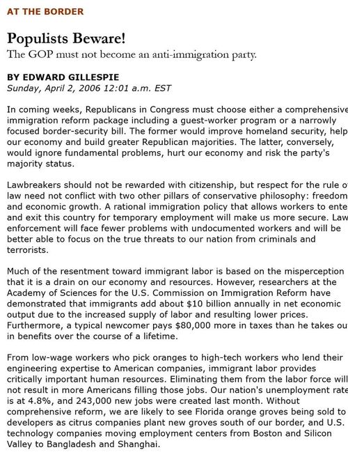 In coming weeks, Republicans in Congress must choose either a comprehensive immigration reform package including a guest-worker program or a narrowly focused border-security bill. The former would improve homeland security, help our economy and build greater Republican majorities. The latter, conversely, would ignore fundamental problems, hurt our economy and risk the party's majority status.Then there was this:Populists Beware! The GOP must not become an anti-immigration party, April 2, 2006