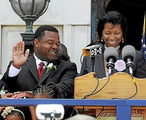 Trenton Mayor, now inmate, Tony Mack, being sworn in by soon-to-be-inmate Judge Lamarre-Sumners [Picture from The Trentonian Newspaper]