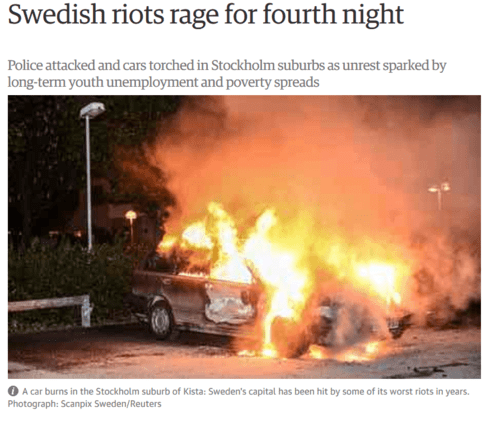 I'm not just talking about garish populist tabloids, either. In thirty seconds of searching I found this story from the London Guardian, which is a serious heavyweight newspaper with an editorial line to the left of Walter Ulbricht. Date: May 23rd, 2013—almost four years ago. Headline: Swedish Riots Rage For Fourth Night Opener: