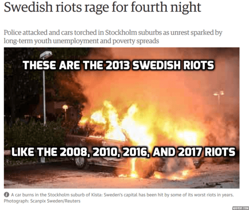Those 2013 riots weren't a one-off, either. Rioting Muslims are a regular feature of Swedish life nowadays.(In 2008, 2010, 2013, and 2016—not an exhaustive list.) I read the newspapers, including the European ones, every day. I could have told the American media folk about it, if they'd asked.