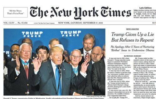 "Trump Gives Up a Lie But Refuses to Repent" howled the headline over the lead story in The New York Times.
