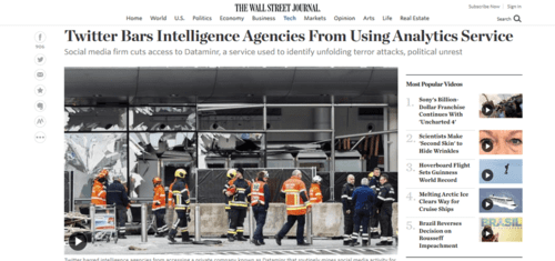Answer: The preening social justice nitwits at Twitter who, according to the Journal's intel sources, are concerned with the negative impression some in the public might have because Dataminr teamed with the government against Muslim terrorists.