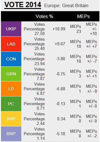 But it is the British news that most interests me. The clear winner of the elections was the UK Independence Party, led by Nigel Farage. Here are the results so far (7 am EST) declared: