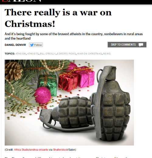 “War On Christmas myth” is good, coming from Salon—when it’s not saying the War On Christmas a complete myth, it’s publishing some of the most vicious anti-Christian, anti Christmas writing out there.