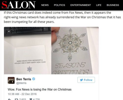 Salon is using what appears to be a “Happy Holidays” card from Fox’s corporate communications department to continue its regular “War On Christmas” hate. What’s interesting is that it wants to use Fairleigh Dickinson professor Dan Cassino’s Harvard Business Review article (debunked here and here) to bash Trump and us: