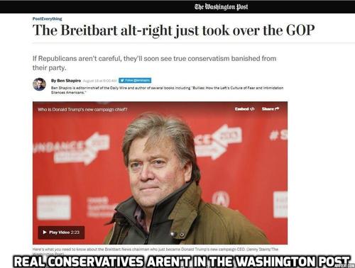 He ran to the Washington Post to complain that the “Breitbart Alt Right” had taken over the GOP following Steven Bannon’s elevation in the Trump campaign. Shapiro claims the Alt Right is different from “constitutional conservatism”:
