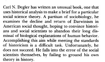 Times change. In 1992 Carl Degler was unfairly criticized for not “historicizing” and “problematizing” sociobiology. In 2017, I have been condemned for merely mentioning the word sociobiology in a book review!
