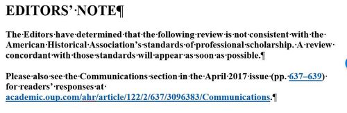 The Interim Editor of the AHR, Professor Robert A. Schneider [Email him] has acknowledged that he “linger[ed] over that last sentence.” [ The Wrong Reviewer | Leading history journal apologizes for assigning review of book on inequality and urban education issues to a professor viewed by many as a white supremacist, By Scott Jaschik, Inside Higher Ed, April 18, 2017].