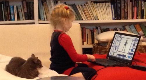 Peter Brimelow’s daughter Felicity studying radical approach with help from Trooper Cat, December 2014.