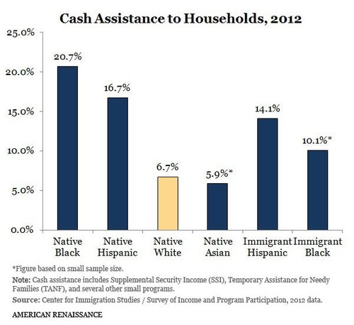 Among natives, blacks receive cash handouts at more than three times the white rate; Hispanics at more than twice the white rate. Rates for black and Hispanic immigrants are relatively lower due to often-ignored restrictions on immigrant use of these programs.