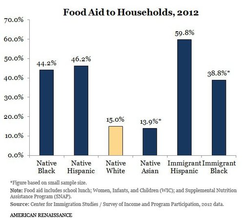 Among all households, native blacks and Hispanics receive food handouts at three times the white rate; for Hispanic immigrants, the figure is four times the white rate. Among households with children, nearly all immigrant Hispanics–86 percent–get food aid. Native blacks and Hispanics aren’t far behind, with rates of 75 and 72 percent, respectively.