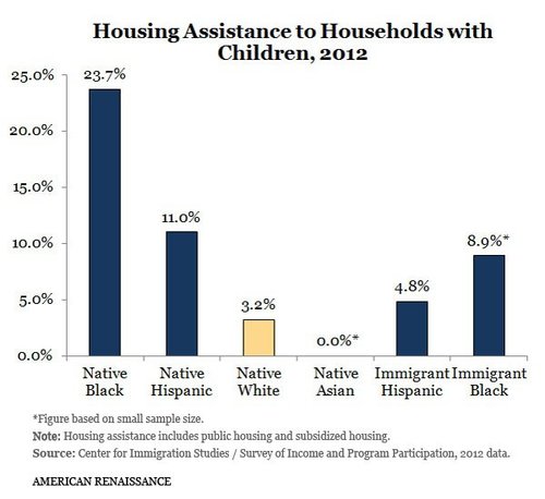 Native Hispanics and blacks, especially, are also heavy users of housing assistance. Among households with children, native Hispanics use these programs at nearly four times the white rate and blacks at seven times the white rate. Some effort is made to limit the access of illegal immigrants to subsidized housing, which helps explain why Hispanic immigrants get housing handouts at less than half the rate for native Hispanics. Amnesty for illegals would mean a sharp rise in the percentage of Hispanics in public or subsidized housing.