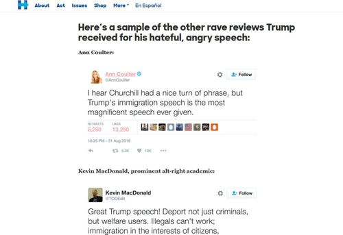 Hillary Clinton has tried to use the Alt Right as an albatross around Trump’s neck. She notoriously gave a speech stating the Alt Right “has effectively taken over the Republican Party.” And her campaign has continued to highlight Trump’s supposed connections to the movement, such as Jared Taylor and Kevin MacDonald’s praise for Trump’s fantastic immigration speech. [Donald Trump’s immigration speech got rave reviews—from all his biggest fans, HillaryClinton.com, September 1, 2016].