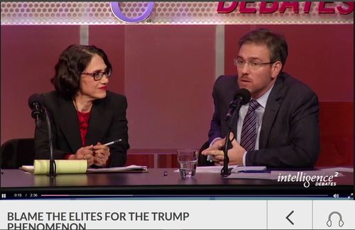 It's not hard to find evidence of this. Example: one of the "Intelligence Squared" debate series that took place September 13th. The motion to be debated was "Blame the Elites for the Trump Phenomenon." It lasts an hour and 44 minutes.[Transcript PDF]