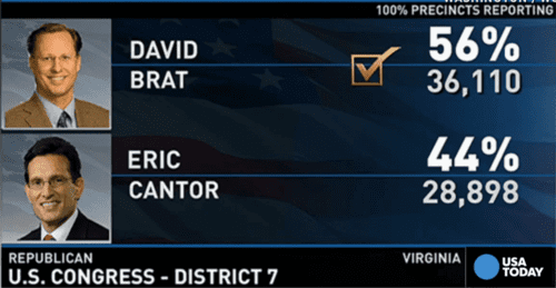 * In the first of 2014's political earthquakes, obscure and underfunded economics professor Dave Brat decisively knocked off House Majority Leader Eric Cantor in the Republican primary for Virginia's Seventh Congressional District. (This was the first time ever that a sitting House Majority Leader had been defeated in a primary.) As VDARE.com's Washington Watcher showed, Brat's victory had everything to do with focusing on patriotic immigration reform.