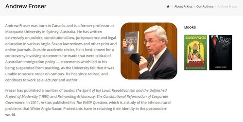 VDARE.com readers may be interested in Dissident Dispatches’ brief references to our Editor Peter Brimelow. These occur in the context of Fraser’s (not unfriendly) critique of Jared Taylor’s White Identity, to which Fraser (who was born in Canada and educated there and in the U.S.) would prefer a more specifically Anglo-Saxon consciousness: