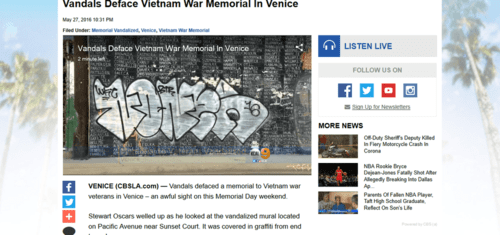 Vandals Deface Vietnam War Memorial In Venice, CBS, Los Angeles, May 27, 2016