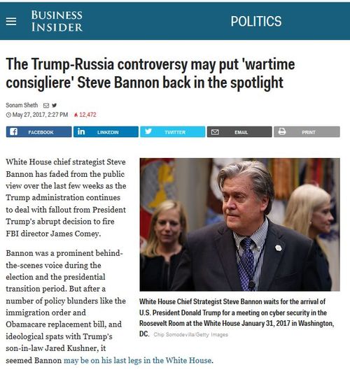 Kushner is usually pinpointed by those hoping for an America First foreign policy and populist policies on trade and immigration as the most destructive influence within the White House. Now, as Kushner may be nearing his last days in the White House, Steve Bannon is now returning to prominence within the administration and is gearing up to lead the counter-offensive against the enemy media [The Trump-Russia controversy may put ‘wartime consigliere’ Steve Bannon back in the spotlight, by Sonam Sheth, Business Insider, May 27, 2017].