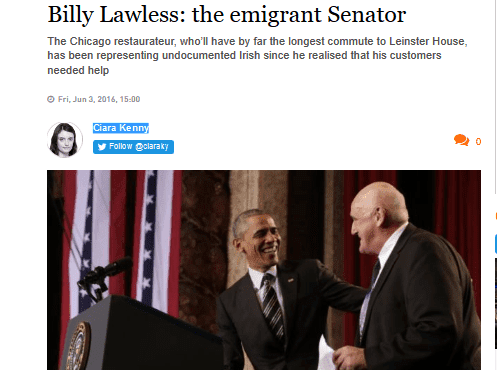 Billy Lawless has been a very prominent agitator for overturning the immigration laws of the US, to the extent that he was trotted out by Obama here in Chicago in conjunction with Obama’s executive action relating to non-enforcement of immigration law. As reported in the Irish Times, he was very involved in having the State of Illinois grant driving licenses to illegals. He became a US citizen, and has now been appointed a member of the Irish Senate. [ Billy Lawless: the emigrant Senator |The Chicago restaurateur, who’ll have by far the longest commute to Leinster House, has been representing undocumented Irish since he realised that his customers needed help, By Ciara Kenny, Irish Times, June 3, 2016]
