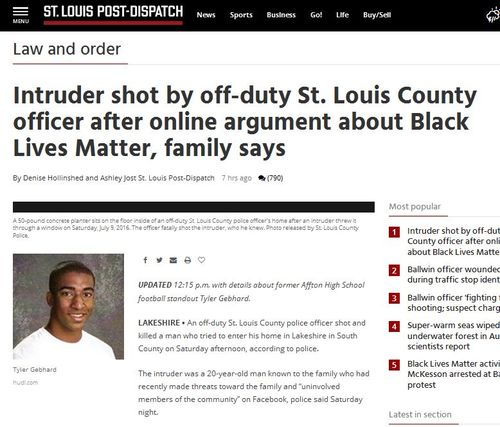 See a previous letter from the same writer.Intruder shot by off-duty St. Louis County officer after online argument about Black Lives Matter, family says By Denise Hollinshed and Ashley Jost, St. Louis Post-Dispatch, July 10, 2016