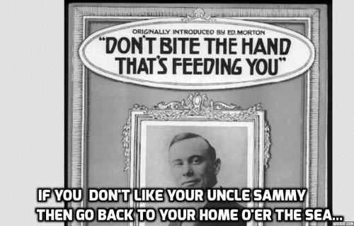 There is a very similar American song called "Don't Bite The Hand That's Feeding You" dating from 1915, when immigrants were often involved in radical anti-American politics: