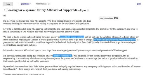 One of the things which never ceases to amaze me about our dysfunctional immigration system is how flagrantly people-both Americans and aliens-publicize their violations. A case in point is this recent Craigslist posting [Archive.is link] requesting a sponsor for someone involved in a "genuine" love match with an American.