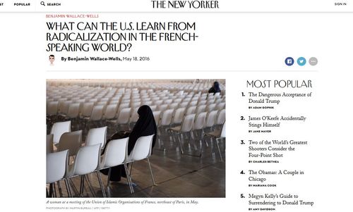 Maybe someone can see it in this New Yorker article—I didn't. [What Can the U.S. Learn from Radicalization in the French-Speaking World? By Benjamin Wallace-Wells , May 18, 2016]It reinforces the case that a lot of tender young vibrant enrichers from Islam tend to go radical because of shabby treatment from Westerners once they immigrate. That's been THE default position of our deep thinkers for 50+ years now: Whenever something bad happens in the world, it's fault of racist, hate-filled Western butterflies flapping their wings somewhere in placid Whiteyland.