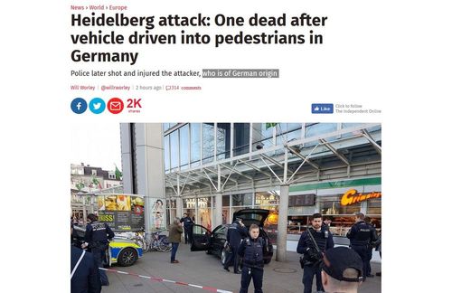 "There was no immediate word on the man's possible motives or his origin." [Heidelberg attack: One dead after vehicle driven into pedestrians in Germany | Police later shot and injured the attacker, who is of German origin, by Will Worley, The Independent, February 25, 2017 ]Well, maybe I'm being cynical but I think if the perpetrator was Volksdeutsche we would have heard by now.