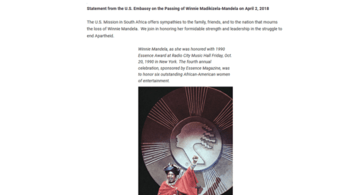 The U.S. Mission in South Africa offers sympathies to the family, friends, and to the nation that mourns the loss of Winnie Mandela. We join in honoring her formidable strength and leadership in the struggle to end Apartheid.As those not blinded by indoctrination from the rainbow nations know, Ms. Mandela was involved in ugly forms of terrorism but benefited from the mantra of the modern age which is "white skin bad/dark skin good". Perhaps the State Department felt compelled to make the statement, not wanting to rock the boat. And perhaps we are lucky they didn't just say “One Settler, One Bullet.”Statement from the U.S. Embassy on the Passing of Winnie Madikizela-Mandela on April 2, 2018 | U.S. Embassy & Consulates in South Africa