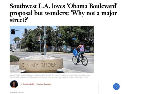 Southwest L.A. loves 'Obama Boulevard' proposal but wonders: 'Why not a major street?'By Sonaiya Kelley, LA Times, June 24, 2017