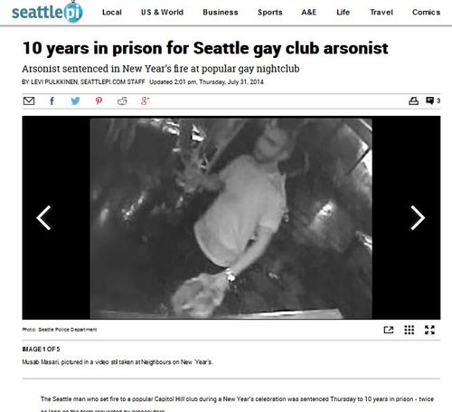 That much was consistent with the MSM narrative of such violence being a matter of (presumably) native Christian gay-hatred. I, of course, being curious and open-minded, set about googling the incident—and was shocked, shocked I tell you to find this would-be arsonist and gay-murderer named as one Musab Masmari, a Libyan. [10 years in prison for Seattle gay club arsonist |Arsonist sentenced in New Year’s fire at popular gay nightclub, By Levi Pulkkinen, SeattlePI.Com, July 31, 2014]