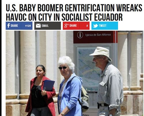 U.S. Baby Boomer Gentrification Wreaks Havoc on City in Socialist EcuadorNow isn't this just the most interesting thing ever? I can't help but NOT be sorry for any Latin American country that exported its poor north to the U.S. when it starts to complain about the reverse effect caused by our Boomers moving south.By Frances Martel, June 8, 2017