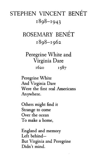 James Fulford writes: It depends on what you mean by real Americans. According to Stephen Vincent Benet, who died before the age of Multiculturalism, the first "real Americans" were Peregrine White and Virginia Dare, the first two English children born in America. And just think, they'd never heard of the Statue of Liberty or the Melting Pot. (Full poem here.)