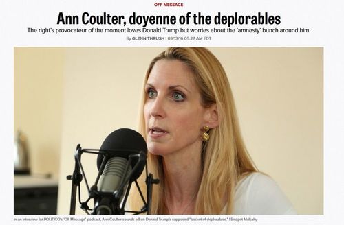 I would like to begin the process of declaring Ann Coulter (peace be upon her) the patron saint of the Alt-Right. There is no wiser or fiercer protector residing on the North American Alt-Right landmass. I well realize that technically our beloved and most virtuous Ann Coulter (peace be upon her) should be in the hereafter before canonization can proceed, but we live in unusual times and I believe a special dispensation should be made.