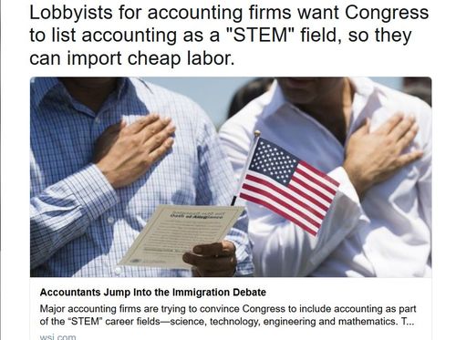 Marcus Sauer 21 hours agoThe big firms are trying to get accounting considered a STEM field, which will mean more visas.I recall getting a master of accounting at a top American University; my class was literally 80% Chinese. When the Big 4 accounting firms came around, they recruited ONLY Chinese nationals did not even interview any American students.