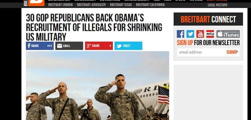 Breitbart has a story reporting that 30 GOP Republicans Back Obama's Recruitment of Illegals for Shrinking US Military.[by Neil W. McCabe, June 17, 2016]