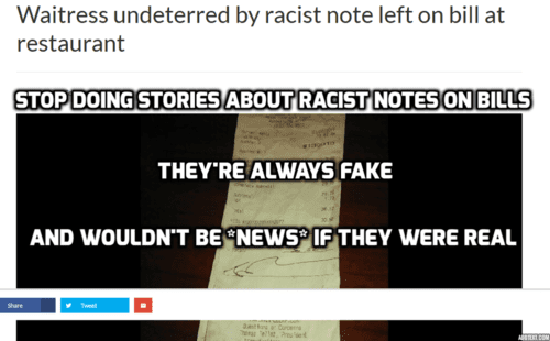 Lawyer: Racist Note Given To Black Waitress In Virginia Is A FakeJames Fulford writes: An interesting story of media reaction.By Chuck Ross, Daily Caller, February 25, 2017