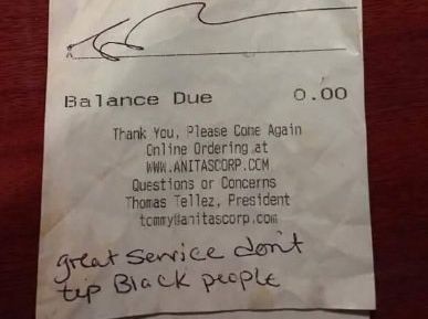 Kelly Carter, a waitress at Anita’s New Mexico Cafe in Ashburn, Va., claimed that a white man stiffed her on his $30.52 restaurant bill and wrote “Great service, don’t tip black people” at the bottom of his receipt.