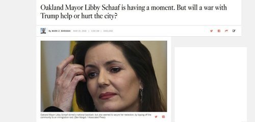 A headline for a recent article in the Los Angeles Times claims that Oakland Mayor Libby Schaaf is "having a moment"—though the headline for the print edition purred "Meet The Mayor Who Dared Take On The President". [Oakland Mayor Libby Schaaf is having a moment. But will a war with Trump help or hurt the city?, By Mark Z. Barabak, LA Times, March 19, 2018]It’s as if you were introducing your prospective daughter-in-law-to the relatives, or as if she was the next glamorous star of The Bachelorette, when in fact a more likely reality show for the gang look-out mayor would be something like “The Radical Misfits Of The Fun House Fringe.”