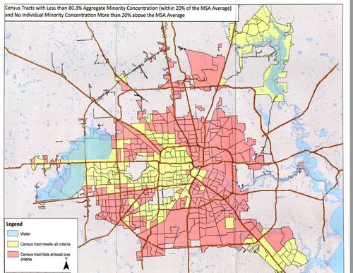 "The Houston Housing Authority (HHA) is moving fast to build a subsidized low-income housing project at 2640 Fountain View at Westheimer, and this is the first step of a larger HHA plan to build subsidized low-income housing projects throughout our neighborhoods in west Houston....See the map—if Whites comprise more than 19.7% of a Zip Code then that place is targeted. Therefore, 25.6% White is too White.I've enclosed a map I recently received from HHA. The neighborhoods marked in yellow are currently being targeted for subsidized low-income multifamily housing projects. This shows that HHA's plan most likely includes your neighborhood."