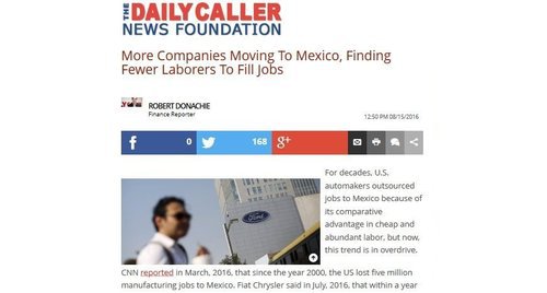 More Companies Moving To Mexico, Finding Fewer Laborers To Fill Jobs, By Robert Donachie, Daily Caller, August 15, 2016Based on the information in this article, I cannot understand how people can take issue with Donald Trump's stance on trade; how does anyone think any working person in this country is going to compete with Mexican labor at $1-3 per hour? Worse yet, I would bet that most of the products being built by these manufacturers in Mexico are then imported into the U.S. for consumption here (by people who then have fewer good-paying job opportunities) without any financial penalty for moving the manufacturing out the country in the first place.