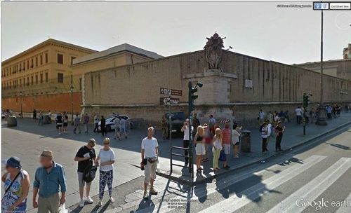 This Google Street view dated 9/2015 actually shows reinforcement of the same corner of the Vatican Walls I wrote you about the other day. The soldier on the right is carrying an assault rifle. In addition, a police car is now deployed at the same spot. "Traveling" around the perimeter using Google Street View reveals additional military trucks and troops parked at regular intervals.
