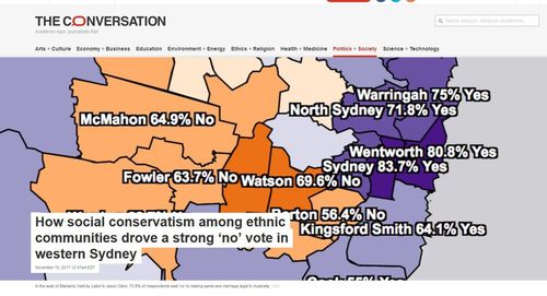 The ‘Yes’ vote triumphed in 133 of Australia’s 150 federal electorates but of the 17 where the vote was lost, 12 were in the Western Sydney region. This geographic epicenter of the “No” vote, not coincidentally, is also the ethnic “Diversity” capital of Australia, containing many of Australia’s largest enclaves of African, Arab and Asian immigrants. The region, in particular, is considered to be the Mini Mecca of Australia. Australia’s Grand Mufti and sundry Muslim Sheiks regularly preach against homosexuality in the regions’ abundant mosques.