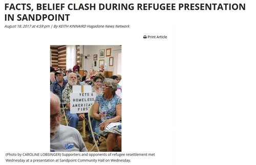 Facts, Belief Clash During Refugee Presentation In Sandpoint,CDAPress.com, August 18, 2017The very headline reeks of cultural Marxism, which continues throughout the account written up by Keith Kinnaird of the Hagadone News Network (from which the Coeur d'Alene Press lifted the story). It turns out that the white ethnomasochist useful idiots running this "refugee" resettlement operation, Nick and Laura Armstrong of Boise, didn't quite receive a warm welcome in the Idaho panhandle. The comments below the story amplify this healthy sense of self-preservation among panhandle residents. This provides at least a bit of encouragement.
