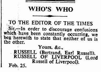 James Fulford writes: Perhaps they could publish a joint letter. In the 1950s two English peers, Lord Russell of Liverpool and Bertrand Russell (The Right Honourable The Earl Russell) kept getting each others' mail. After a brief consultation, they published the following letter in the Times of London: