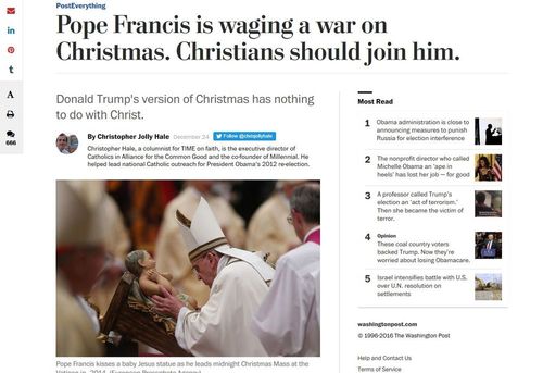 James Fulford writes; The Washington Post's article is called Pope Francis is waging a war on Christmas. Christians should join him, and author Christopher Jolly Hale is an American Catholic layman. I'm afraid that Hale is very much a Religious Left, post-Vatican II Catholic, which means that in 1950's Catholic terms—which weren't that different from 1550's Catholic terms—he's a Protestant. But I can't help that.