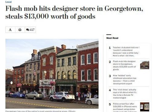 But a look at the bulk of the correspondence over a nine-month period of those using the service had some people expressing suspicions about African Americans. About 90 percent of the photographs that were put up showed blacks."[ Flash mob hits designer boutique in Georgetown, steals $13,000 worth of goods, Dana Hedgpeth and Peter Hermann, Washington Post, November 25, 2015]