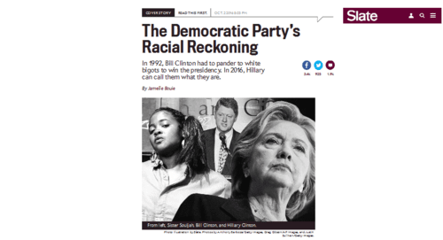 From Slate in October, an explanation that due to changes in the electorate, Democrats don’t have to stoop anymore to the indignity of pretending that they don’t agree with identity politics extremists like Bill Clinton did in 1992 by denouncing the rapper who called for a week of murdering whites: