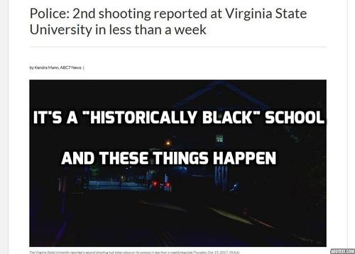 Police: 2nd shooting reported at Virginia State University in less than a weekBoth shootings, which were not fatal—yet—were reported as isolated incidents. Why? It’s a “Historically Black” school—and these things happen.by Kendra Mann, ABC7 News, October 20, 2017
